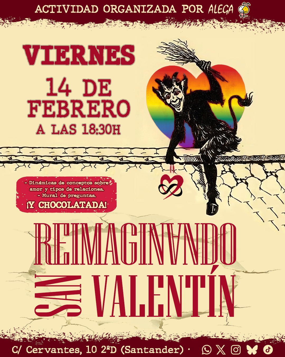 El viernes 14 de febrero tenemos un dulce y divertido plan para ti. Escaparemos del amor monógamo-normativo hegemónico para descubrir otros tipos de amor y de relaciones, compartiremos dudas y romperemos estereotipos mientras disfrutamos de un rico chocolate ☕.